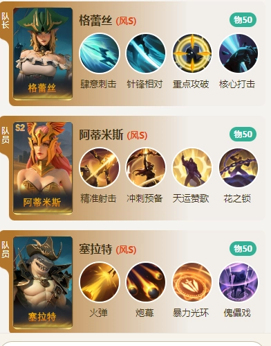 极致的爆头,物理输出拉满,专门打对方队长,一旦爆头即可速胜。阿蒂米斯提供物攻加成,塞拉特提供减伤,其他交给格蕾丝即可。
