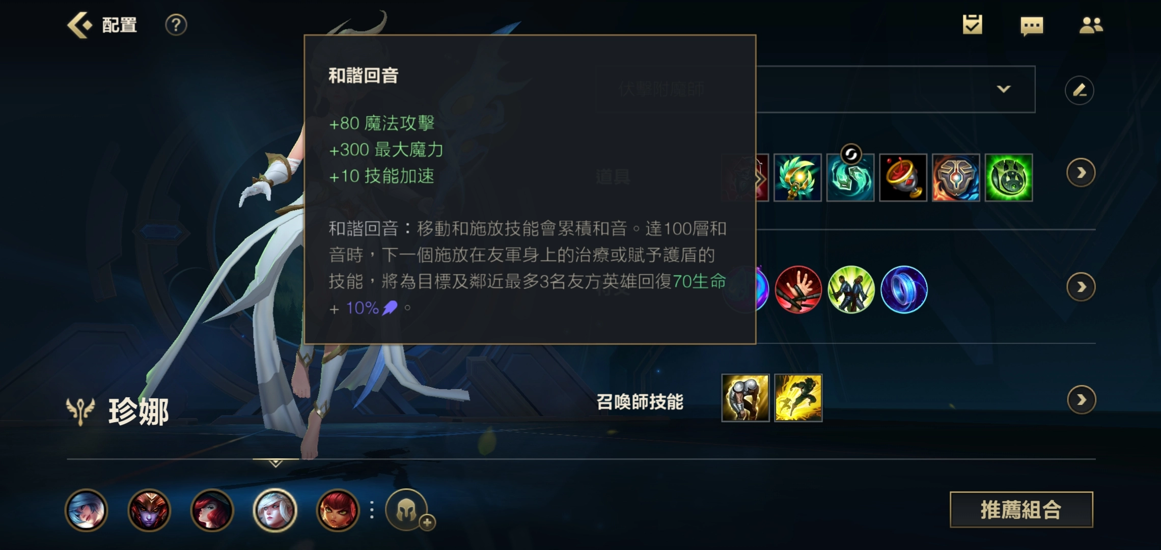 第二件装备选择和谐回声,这件装备的机制是积累装备buff,当buff叠加到100层时,我们的下一个护盾或者大招,就能为附近三名队友回复生命值。并且该装备的buff可以通过移动来积攒层数,恰好风女的被动能提升移速,能更高效地触发这个buff效果。