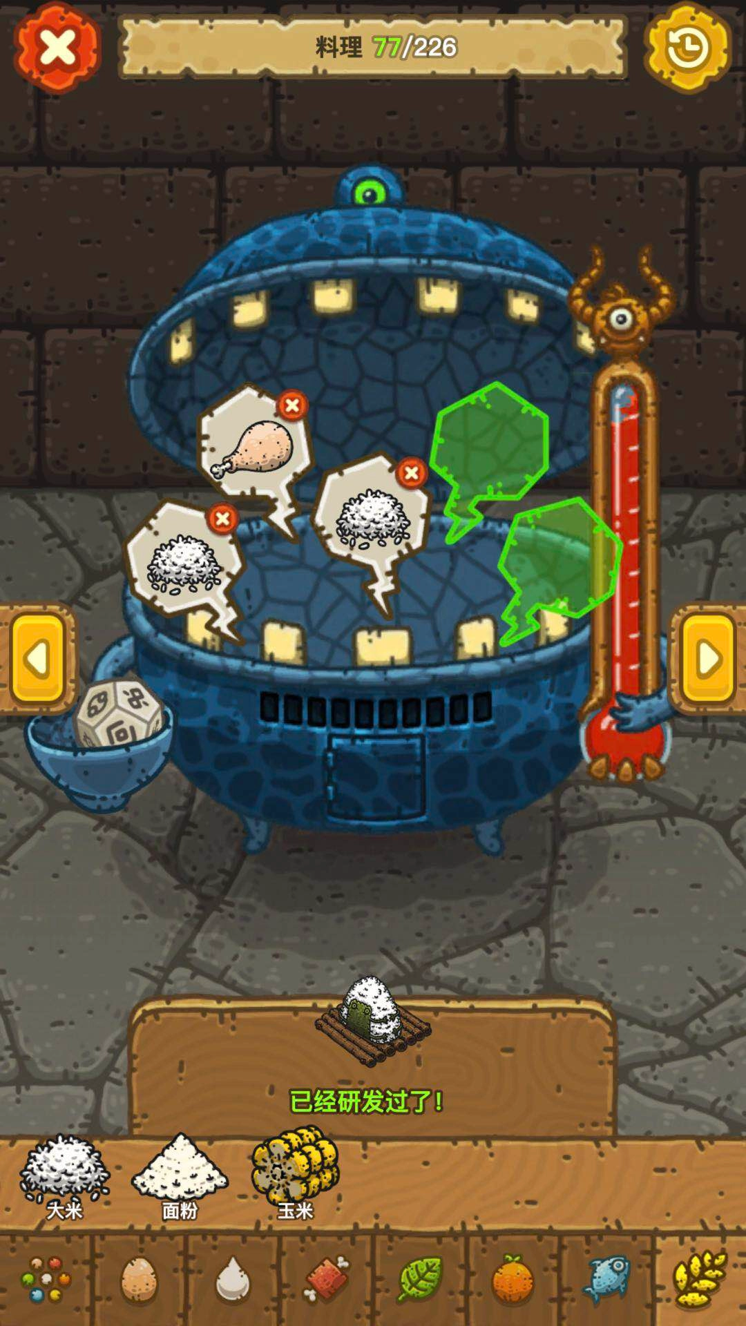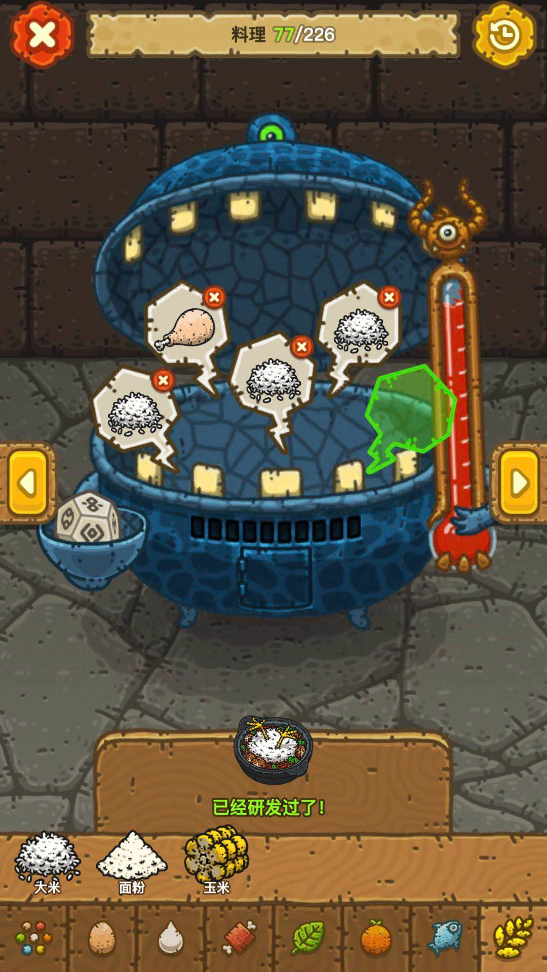 找到主要食材后,就可以去料理锅怪物那儿尝试了。我们先往里面丢入一份大米和一份鸡肉,观察怪物的反应——此时温度计并未沸腾。要知道,只有当温度计沸腾时,才说明这种食材搭配能够研发出对应的料理。
