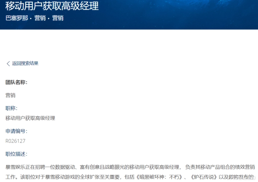 转机出现在10月中旬,暴雪巴塞罗那团队意外发布了一则“移动用户获取高级经理”的招聘信息,该职位需要应聘者拥有5年以上移动游戏用户获取相关经验,或是10年以上数字营销领域的从业背景,并且要具备成功管理过百万美元级别预算、在全球范围推动手游用户规模增长的实际操作能力。