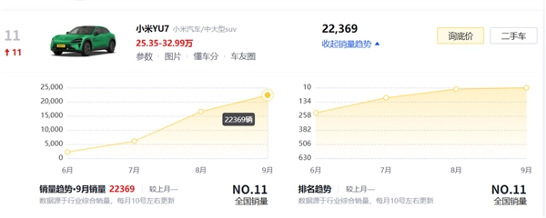 根据懂车帝销量排行榜的数据,小米YU7在9月份售出22369辆,在全国所有车型综合排名中位列第11名。