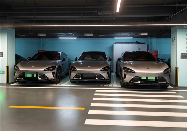 从图中可以看到,三辆钛金属色的小米YU7停在相邻的三个车位上,它们的外观、颜色完全相同,轮毂也几乎一致,简直就像是“复制粘贴”出来的一样。