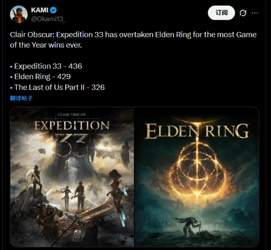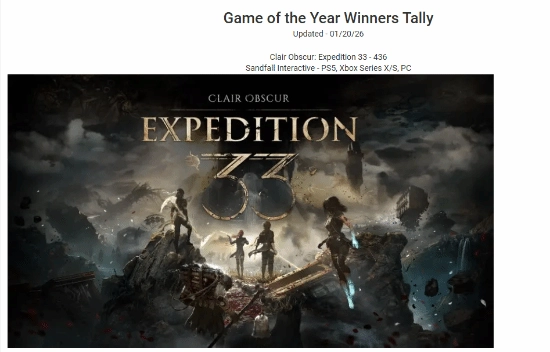 截至目前,共有436家媒体将年度游戏奖项授予《光与影:33号远征队》,而《艾尔登法环》此前保持的纪录为429项年度游戏大奖。