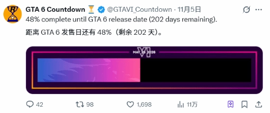 专注于《GTA》系列与R星相关资讯的知名博主@GTAVI_Countdown,长期在社交媒体平台上更新《GTA 6》的发售进度条,通过每日递减的百分比数值与剩余天数,直观呈现游戏发售的临近状态。