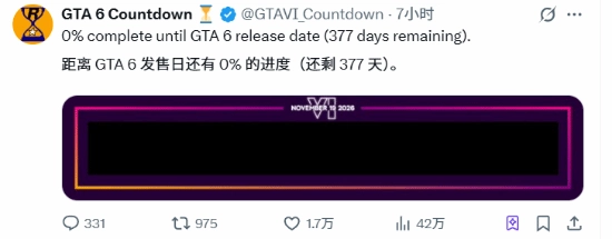 《GTA 6》的发售筹备进度目前为0%,距离发售还剩下377天。