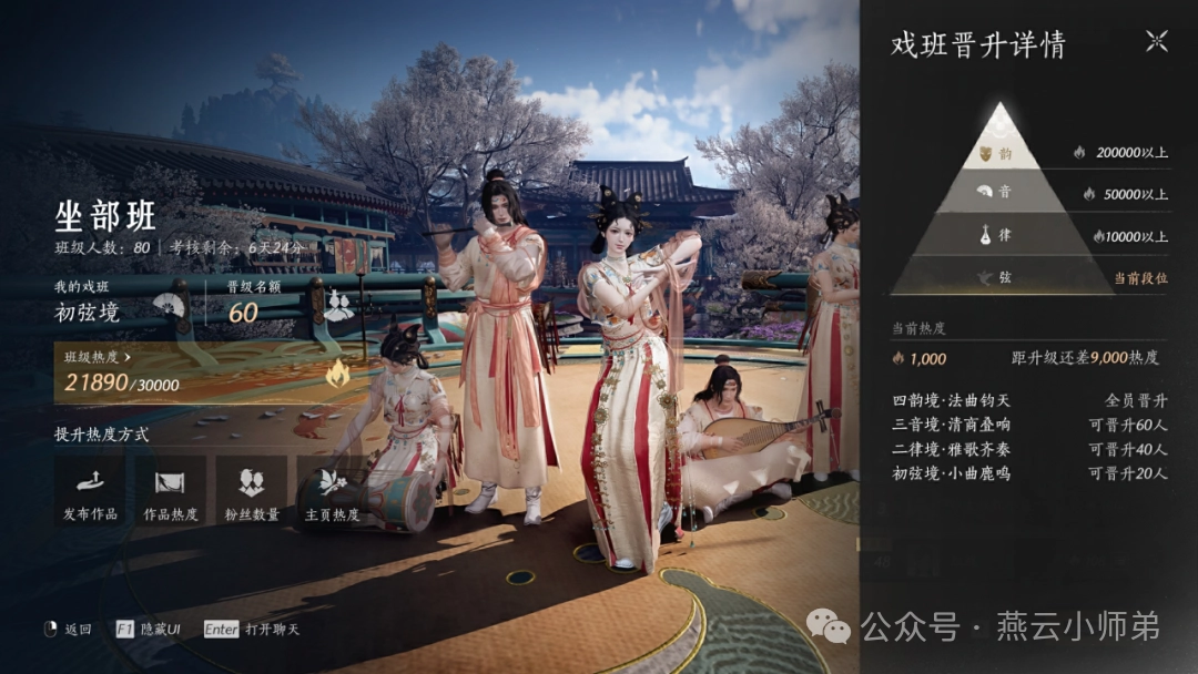 梨园里推出了【戏班】新机制,这里的地位排序除了常规的功绩排名外,还设有依据弟子聚集情况的戏班热度榜!借助这个榜单能推动戏班等级上升!戏班等级越高,晋升的概率就越大,降级的概率则越小。