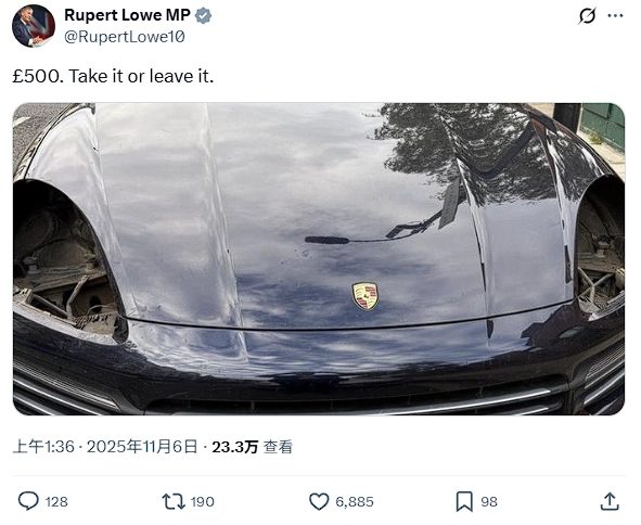 近日,英国独立议员鲁珀特・洛维(Rupert Lowe)在社交媒体上晒出自己爱车的照片,还附上了一条充满怒气的配文:“我妻子的车今天早上被人偷走了大灯。”