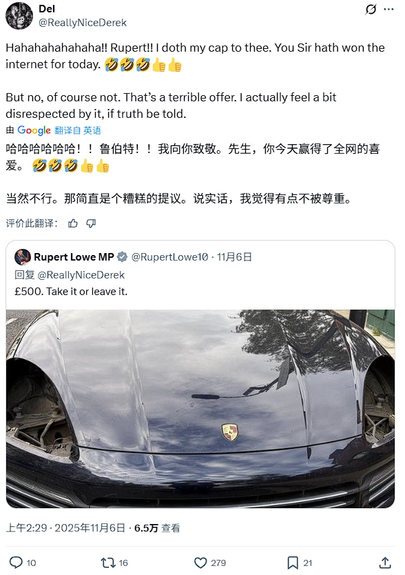 议员也关注到了这条内容,并在线留言称:给你500英镑,卖不卖拉倒。