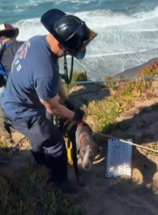 近日,在美国旧金山一处海边悬崖,有只宠物狗不慎坠落,之后在狭窄的壁架上停留了20多分钟,最终等到消防员赶来实施救援。