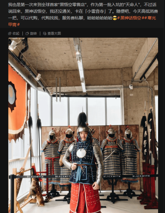 他记录道:“今天是「鑠金」黑神话BLACKMYTH × 寒光甲胄艺术展。惦记老杨的甲胄好长时间了,总算逮着机会亲身感受了一回。这是我人生中第一次穿甲,算是解锁了全新体验。同时,我也是头一回来全球首家‘黑悟空零售店’,作为最早一批‘天命人’玩家,不过说实话,《黑神话:悟空》我还没打完,卡在「小雷音寺」那关了。”