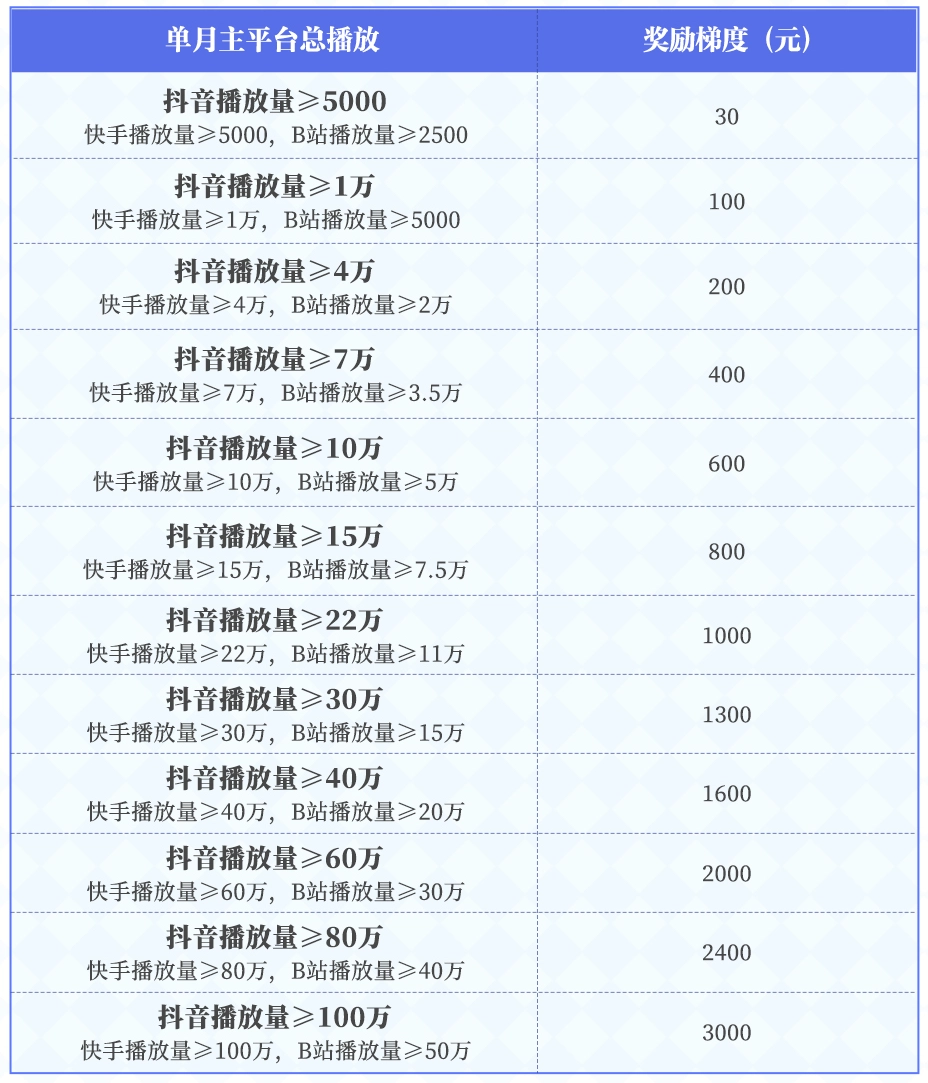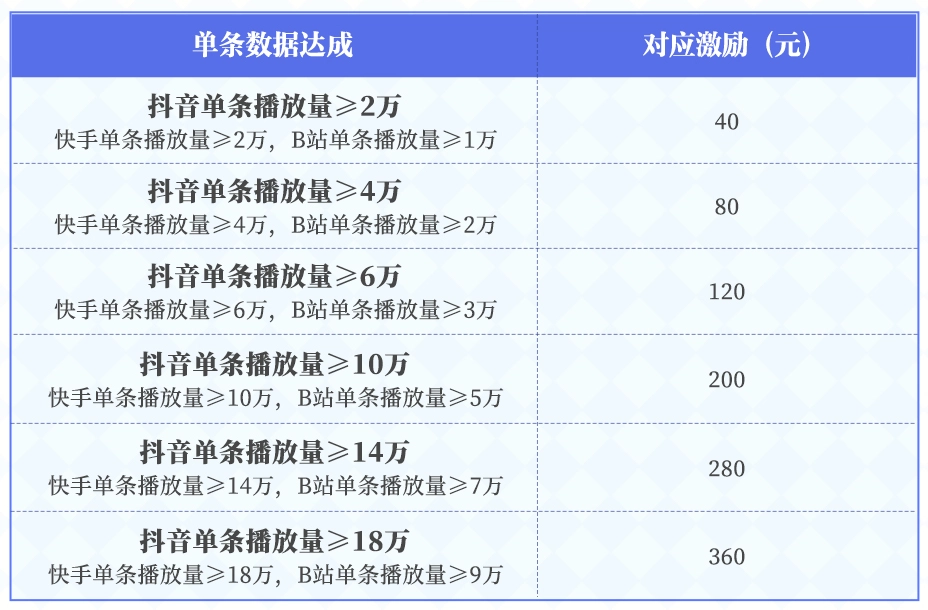 第二期活动,我们会根据勇士报名时选择的主平台,统计播放量最高的50条视频,并按其累计播放量发放对应激励奖金!多劳多得,爆肝不亏!