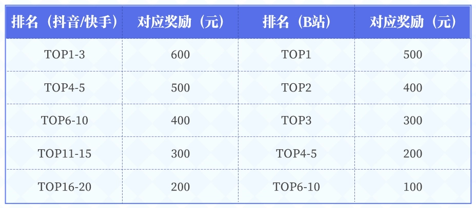 备注:按本期活动个人主平台有效内容发布量之和排名(不含分发平台发布量),且仅统计抖音/快手播放量≥1000或B站播放量≥500的作品,有效内容发布量进入排名的勇士可获得对应奖励。