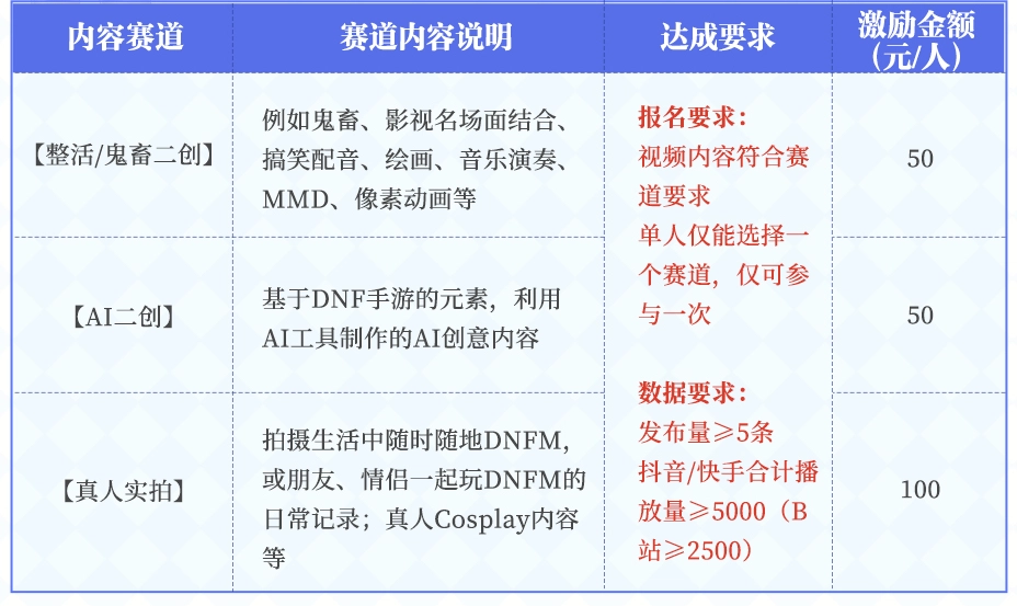 例如拍摄生活中随时随地玩DNF手游,或朋友、情侣一起玩DNF手游的日常记录;真人Cosplay内容等。