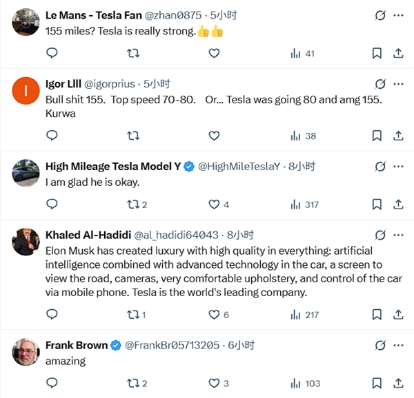 这条帖子吸引了大量关注,评论区里不少网友对特斯拉的安全性表示称赞,也有人为车主平安无事感到庆幸,不过也有部分网友对事件的真实性提出了质疑,觉得从撞击痕迹判断,车速根本没达到155英里/时。