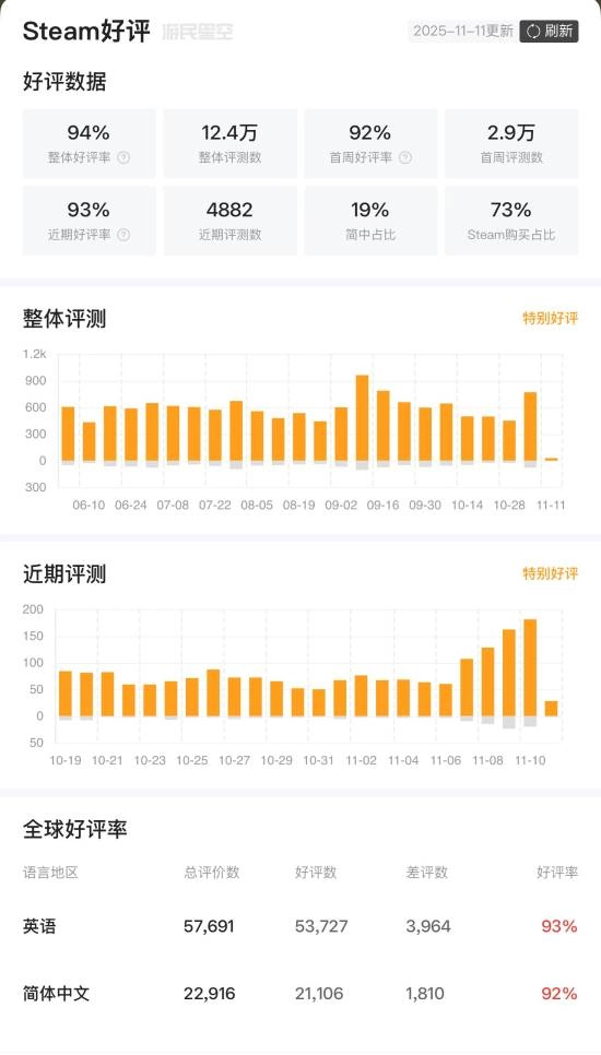 此外,游戏数据目前依旧维持着94%的“特别好评”评价,随着此前免费试玩活动的开启,游戏在线人数稳定突破万人,迎来了新的小高峰。