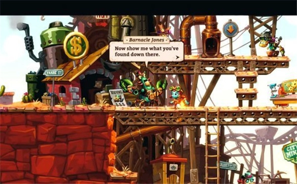 《蒸汽世界2》的主角是前作里的女机器人桃乐西,她为了找寻初代主角Rusty踏上了挖掘冒险之旅。相较于初代,这款游戏不仅画面更为精致,还新增了多种武器与道具,像喷气飞行、游泳功能都得以加入,而画面里新增的小地图对探索也起到了很大帮助。