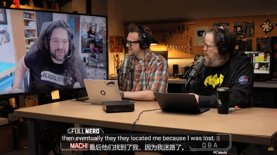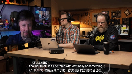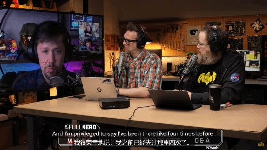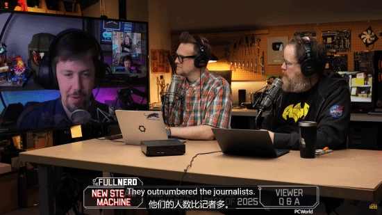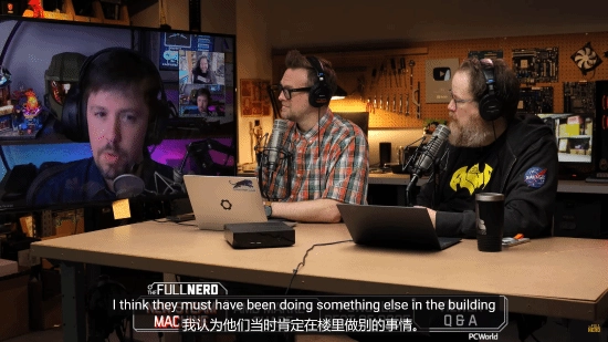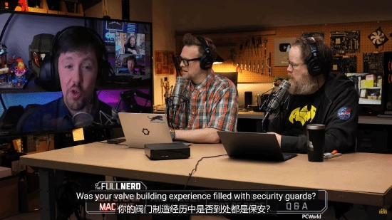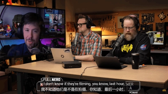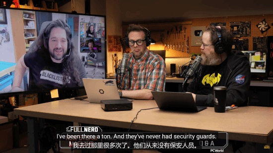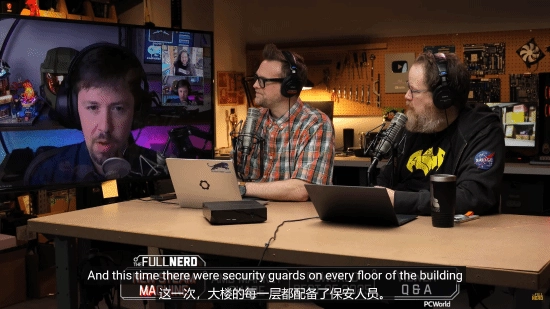 在一期博客节目里,他(见下图左侧大屏幕)向Gamers Nexus的编辑Steve Burke询问,是否留意到现场有大量安保人员。