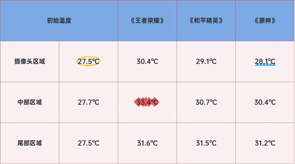 两局《王者荣耀》后,各区域温度仅升至28.1℃-30.4℃;一局《和平精英》后,最高温度出现在摄像头区域,为33.4℃。