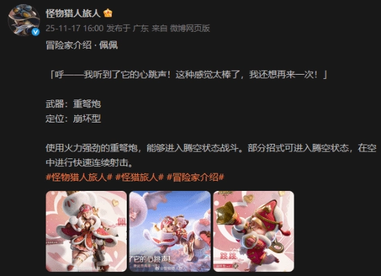 今日,游戏官方微博发布文章,对冒险家“佩佩”进行了简要介绍。根据介绍内容,该角色所使用的武器是重弩炮,其定位为崩坏型。