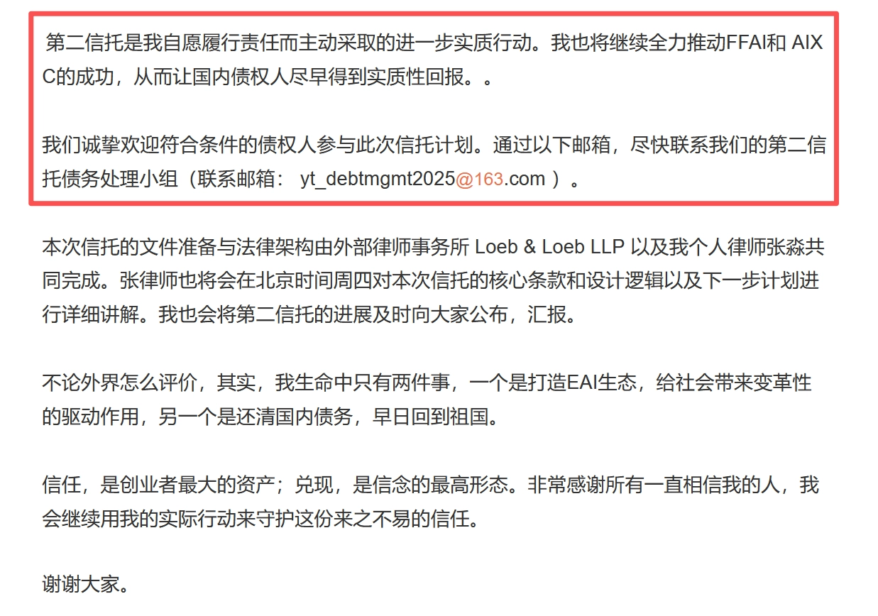 一大早,贾跃亭卡点在微博宣布:第二个债权人信托正式成立,目标是加速偿还国内担保债务,争取早日回国。