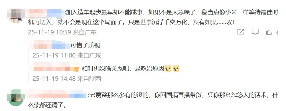 关于能否早日回国这件事,小雷觉得不必急于下定论。毕竟当下汽车行业内卷得厉害,能不能顺利挤入电动车赛道还很难说。再者,贾跃亭和罗永浩不一样,后者可是靠实实在在的行动,一步一个脚印把债务还上了。虽说两人的背景和所处企业的体量存在差异,但诚信与应有的态度还是不可或缺的,更为关键的是——得真正行动起来。