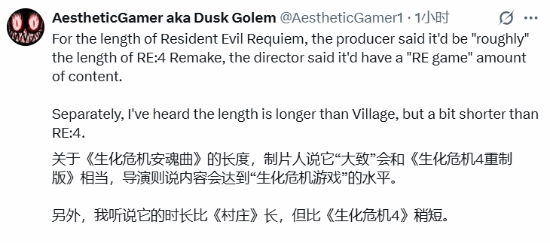 另外,Dusk Golem还透露了《生化危机9》主线流程的大致时长:“我听说它的时长比《村庄》要长,但比《生化危机4重制版》略短。”