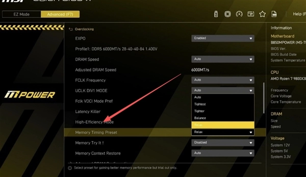 微星提供了4档设置,大家根据自己内存体质进行选择即可,一般选择Relax(好香)或者Balance(真香)即可。