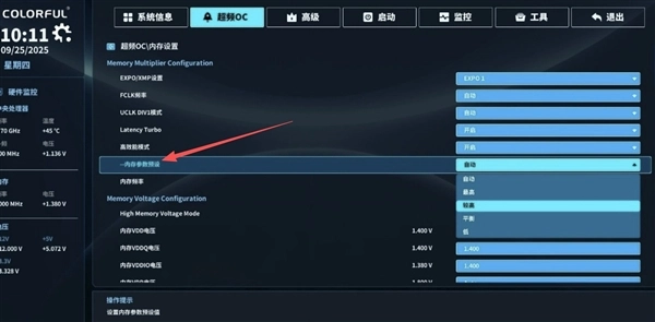 可以看到七彩虹主板同样提供了4种预设档位供大家调节,与上面其他家主板一样,大家根据自己内存体质调整即可。
