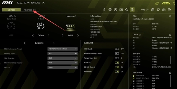微星主板开启一键D5优化功能也很简单,按F7或者点击Advanced选项进入高级设置。