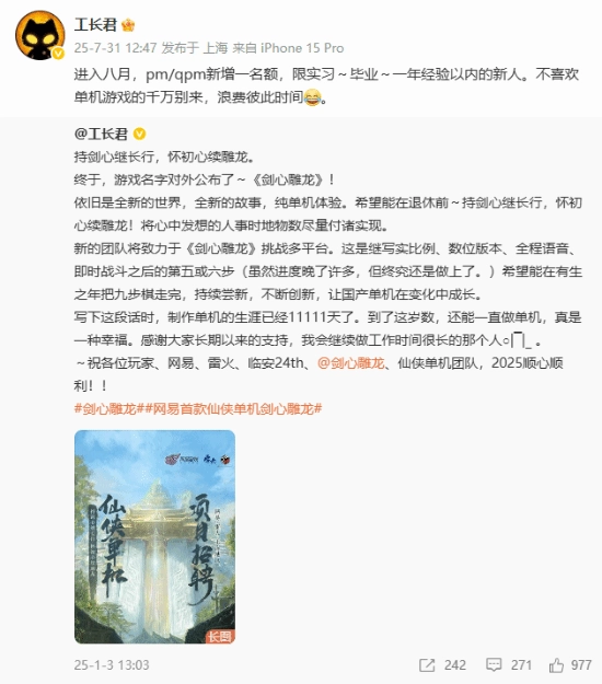 在7月的时候,工长君曾发布过一条招聘微博,内容是:“进入八月后,pm/qpm岗位会新增一个名额,仅限实习、应届毕业或有一年以内工作经验的新人。不喜欢单机游戏的人请一定不要来,以免浪费双方的时间。”