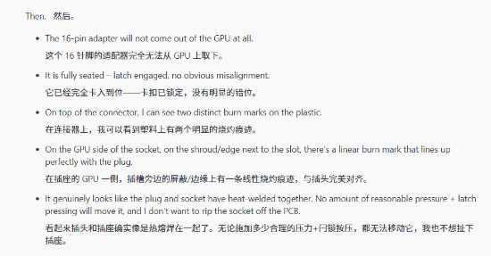最关键的是用户尝试操作后,根本无法从GPU接口上将其拔下,这意味着连接器或许是由于高温熔化,进而与电源接口“粘”在了一起,形成了一个整体。