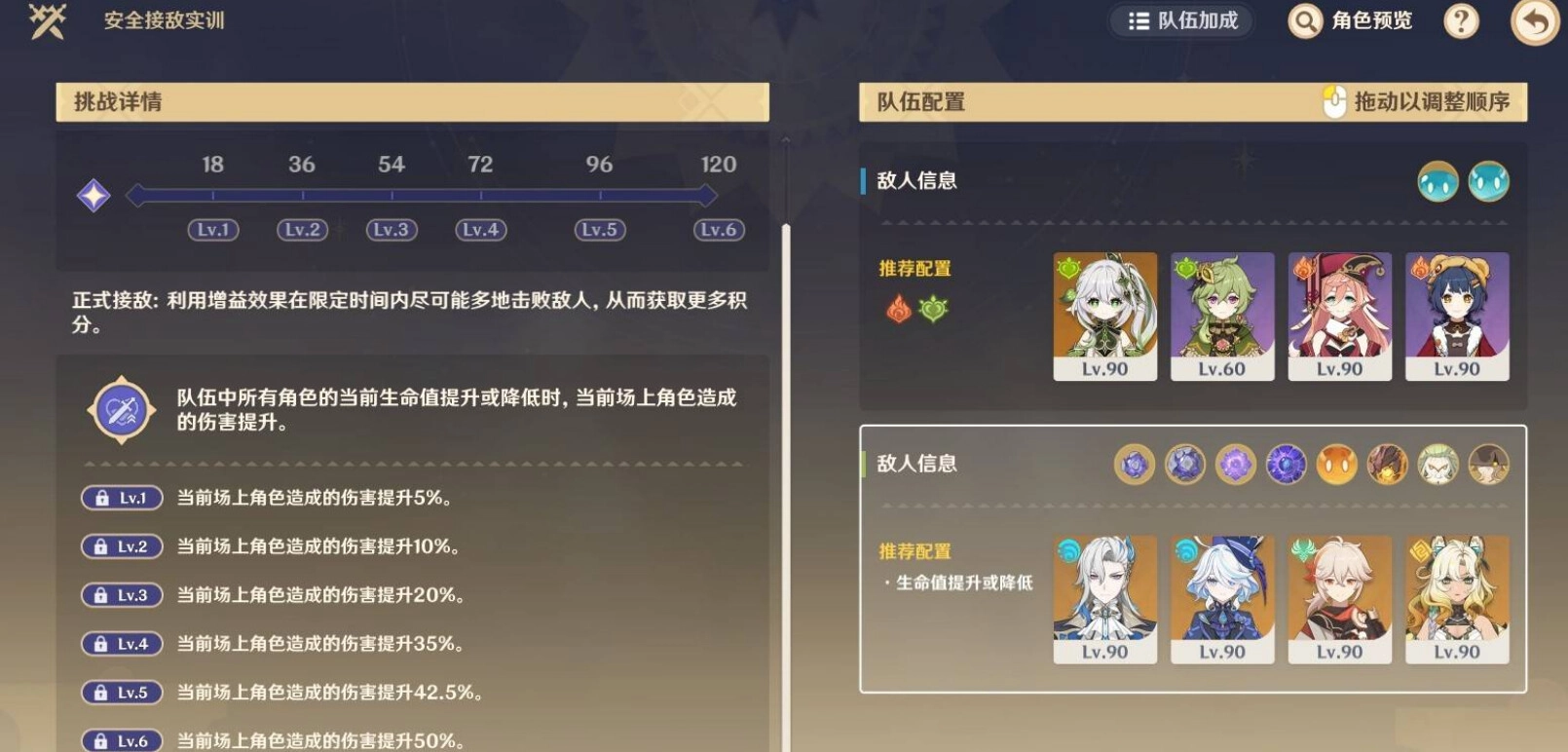四、关卡技巧积分倍率建议选择10倍。第一关先遣准备阶段,推荐搭配草元素与火元素角色;考虑到本关目标是尽可能多地击败敌人(水史莱姆),建议多配置群攻型角色以及能提供后台元素附着的角色,像香菱、柯莱这类角色就比较合适。进入正式接敌环节后,会触发增益效果:当队伍中任意角色的当前生命值出现提升或降低时,场上活跃角色造成的伤害会相应增加。因此,建议选用带有自伤机制的角色,例如芙宁娜、那维莱特、莱欧斯利等,并围绕这类核心角色构建适配的阵容。