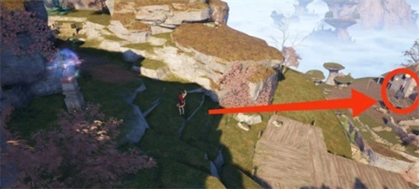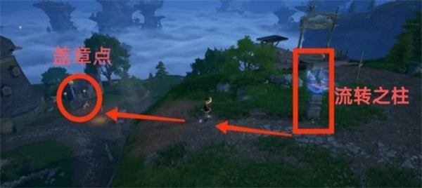 传送至麦浪农场后转身向后,沿着右下方的平台漂浮移动,通过气流柱就能抵达盖章点,它就在石屋的正前方。