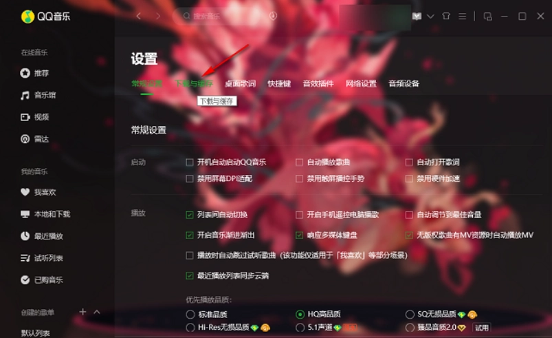 在设置窗口中,点击右上角的【下载与缓存】标签。