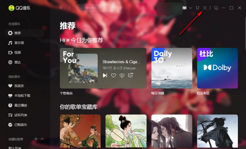 首先启动QQ音乐应用程序,接着点击界面右上角的“三条横线”样式的菜单按钮。