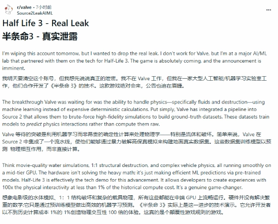 该匿名用户称,自己在一家和Valve合作开发《半条命3》相关技术的“重要AI/ML实验室”工作,并非Valve的员工。