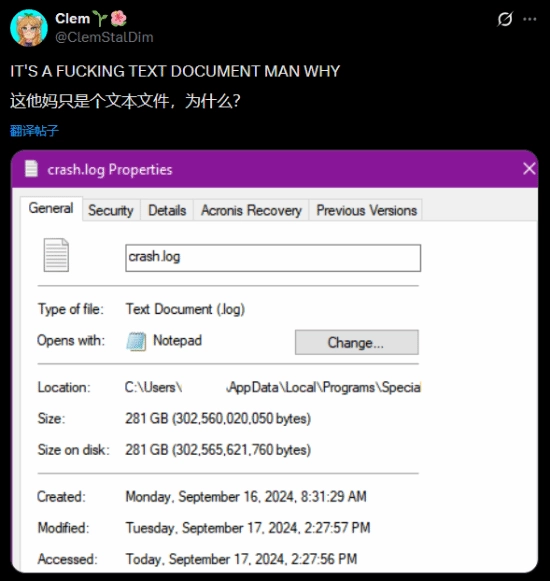 他简单搜索了一下就找到了答案,原来是游戏莫名生成了一个大小约281GB的崩溃日志文本文件!