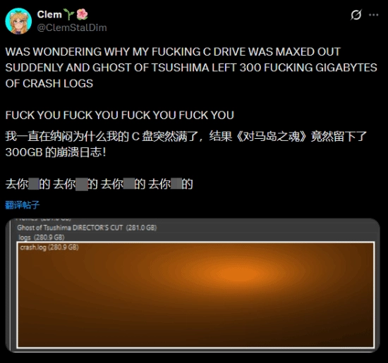 外媒GamePro最近报道了一件挺有意思的怪事:玩家@ClemStalDim在PC端玩《对马岛之魂》时,遇到了一桩蹊跷事——游戏本体明明只有约75GB大小,可他的硬盘却毫无征兆地被占满了。