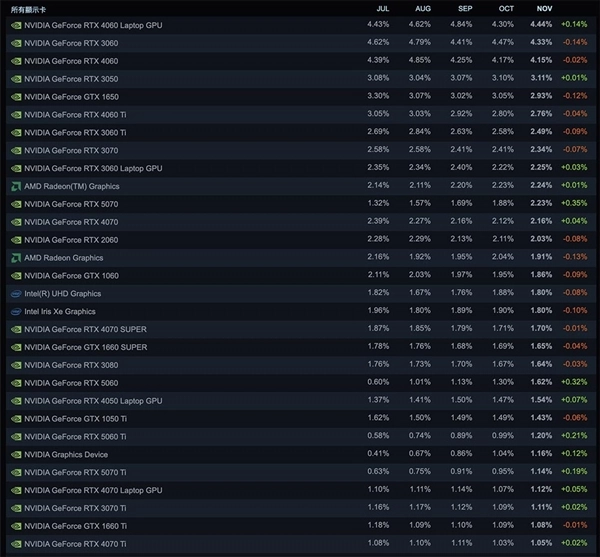 在11月份的调查里,RTX 5050、AMD的RX 9070系列和RX 9060系列依旧没有出现;同时显卡排名的前两位也有变动,RTX 4060 Laptop和RTX 3060又一次交换了位置。