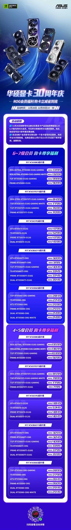 华硕显卡30周年惊喜福利来啦!活动时间为11月28日至12月5日14:00。活动规则如下:1. 11月26日之前,账号中注册过任意显卡产品,且会员等级处于Lv4到Lv7之间的ROG会员,能够在积分商城用0积分兑换优惠券,购买指定型号显卡时可享受专属优惠。2. 每个会员账号在本次活动中仅能兑换一个显卡型号对应的优惠券,购买需在华硕商城进行。兑换成功后,请于12月7日23:59:59前完成下单并使用优惠券,超过时间则失效。活动本周就截止啦,大家赶紧参与吧~
