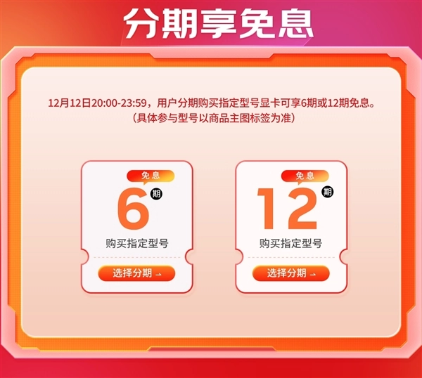 在12月12日20:00至23:59的限时时段里,购买耕升指定型号显卡的用户,可额外享受6期或12期的分期免息优惠。对各位玩家而言,这既能有效缓解支付压力,还能叠加晒单返E卡的福利,解锁双重优惠buff!务必把握这仅4小时的限时机会,千万别错过!
