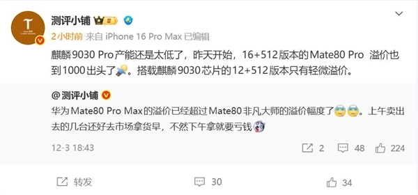 12月8日,手机店主测评小铺发布消息称,麒麟9030 Pro芯片目前产能无法满足市场需求,导致Mate 80 Pro机型中16GB+512GB版本的售价较官方定价高出1000元以上,而12GB+512GB版本则仅出现小幅溢价。