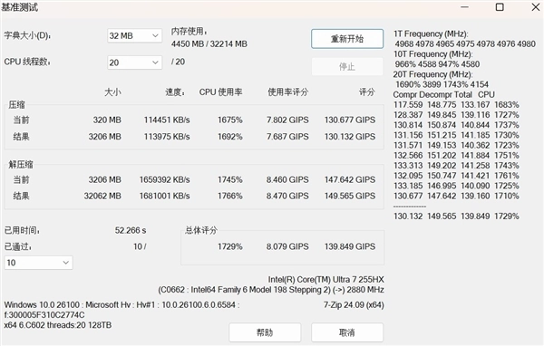 应用性能方面,7-ZIP压缩与解压缩测试,这颗处理器压缩速度为113975KB/s,解压缩速度为1681001KB/s,总评分高达139.849GIPS,拥有相当不错的压缩和解压缩效率。