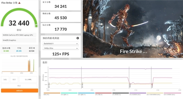 显卡性能方面,RTX 5060笔记本电脑GPU作为入门级显卡,整体性能还是相当能打的。3DMark Time Spy图形分12445,Fire Strike图形分34241,应对日常游戏没有任何问题。
