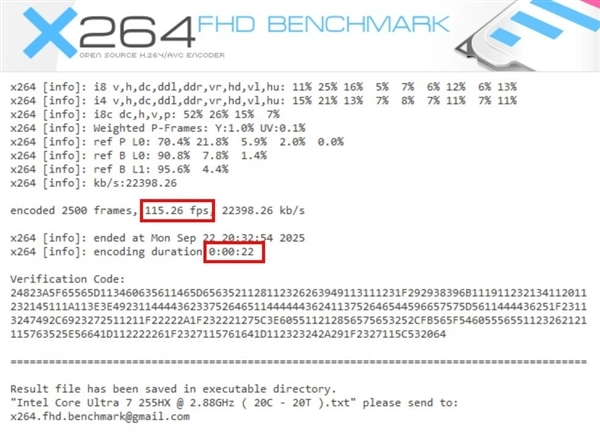 视频编码同样是酷睿Ultra 7 255HX平台常见的应用场景,通过x264 Benchmark测试可知,其完成2500帧编码仅需22秒,编码帧率达到115.26fps,效率表现十分出色。而视频编码向来是英特尔酷睿处理器的优势领域,酷睿Ultra 7 255HX也延续了这一特点,相比友商平台,它更适合作为视频内容创作的生产力平台。