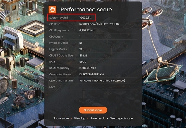 接下来参考Corona 10渲染器的Benchmark测试,可以看到1分钟渲染光线速度达到了10030513rays/s,同样是有着不错的性能表现。