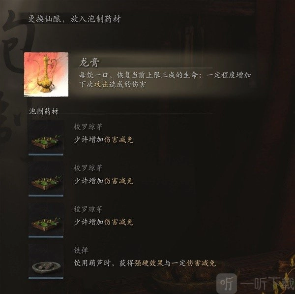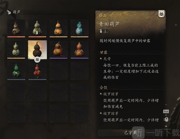 重点来了,前面提到的阴阳法衣,要保持50%以上的血量才能触发效果。而青田葫芦呢,是通过饮酒来触发减伤,并且葫芦自身带有恢复效果。虽说饮酒次数仅有一次,但它具备回复能力。在开启boss战之前喝上一口,就能直接达到满减伤70(挨打80%触发效果这一点后面会详细说明),这样一来基本不用担心被boss瞬间秒杀。再加上安神法的作用,就很难死亡了,毫毛也提供了一定的容错空间。